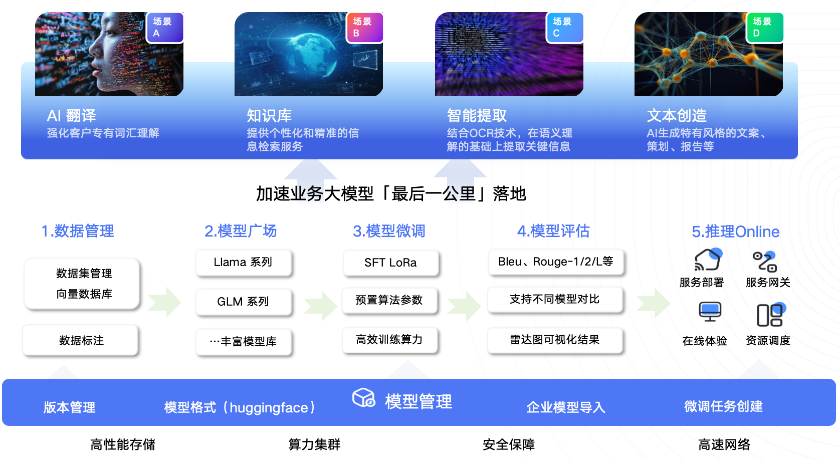 聚焦行业需求:将基础大模型适配到您特定的行业应用,无论是专业知识库翻译、识别医疗影像,还是优化供应链管理,平台都能助您一臂之力。
