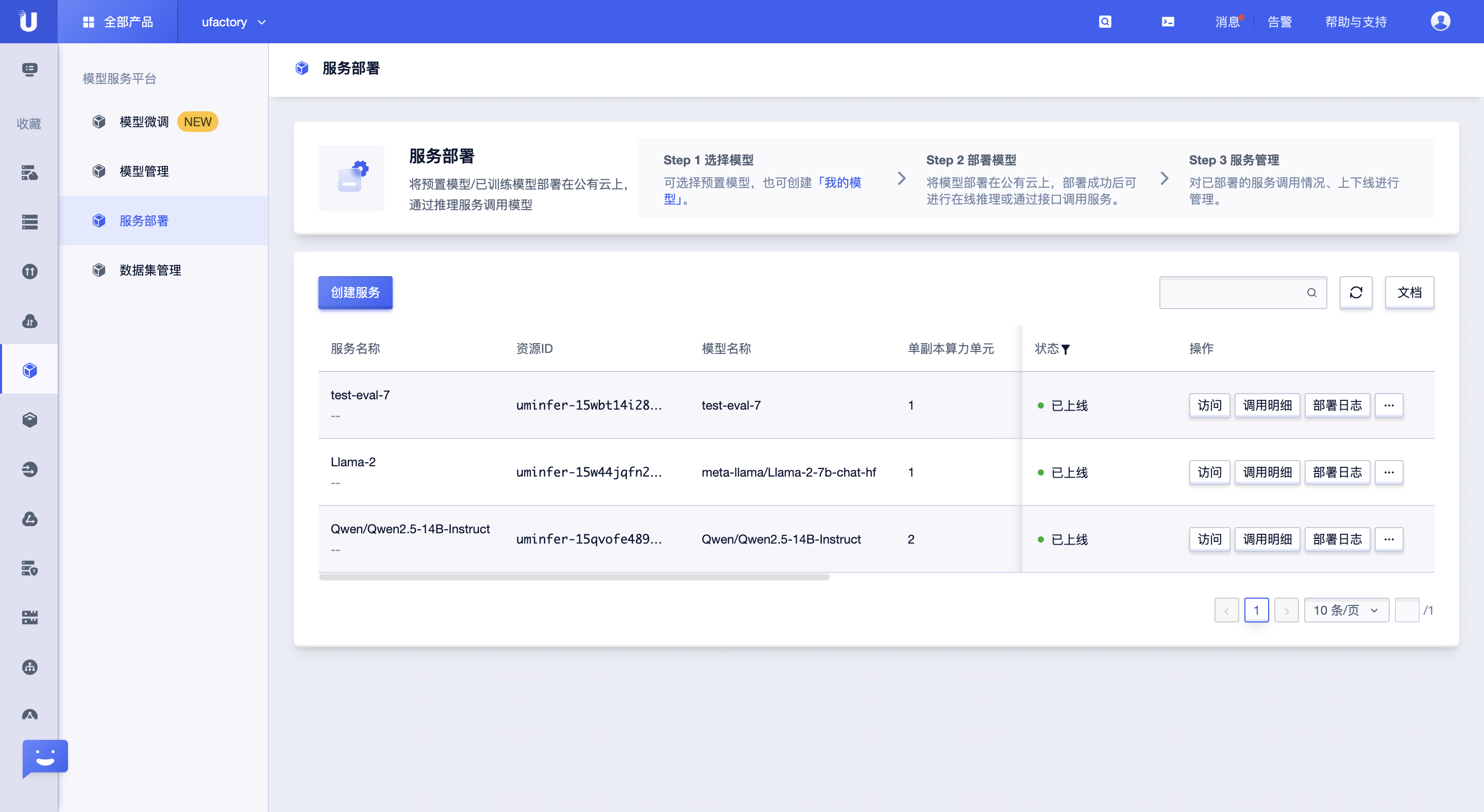 将优化后的AI模型成功部署到生产环境中,才是让AI真正服务于业务的关键。UModelVerse的「服务部署」功能,帮助企业高效、安全地将模型落地。