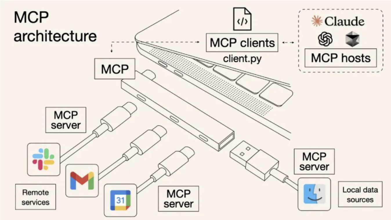 简单来说,MCP是一个为LLM搭建起与外部数据源及工具直接对话的桥梁,聚焦于解决当前AI模型发展深受制约的数据孤岛难题。MCP要求通信格式严格遵循JSON-RPC2.0标准,让不同的数据服务商、工具提供者以及前端应用,在与LLM沟通时能够畅通无阻。从此,LLM仿佛拥有了一个 “万能转接头”,只要各类资源能够符合MCP这套标准,无论是数据、文件系统、开发工具,还是Web和浏览器自动化程序,甚至是各种社区生态能力,都能与LLM实现万物互联,为AI应用赋予强大的协作工作能力。