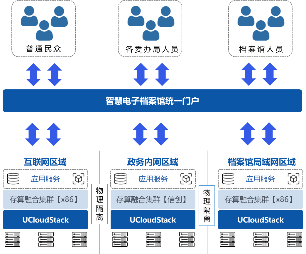 基于三网隔离要求,优刻得在各个网络区域分别部署 UCloudStack,每个区域配置 3 个节点,以轻量化交付缩短项目部署周期,实现档案馆业务的快速上线。