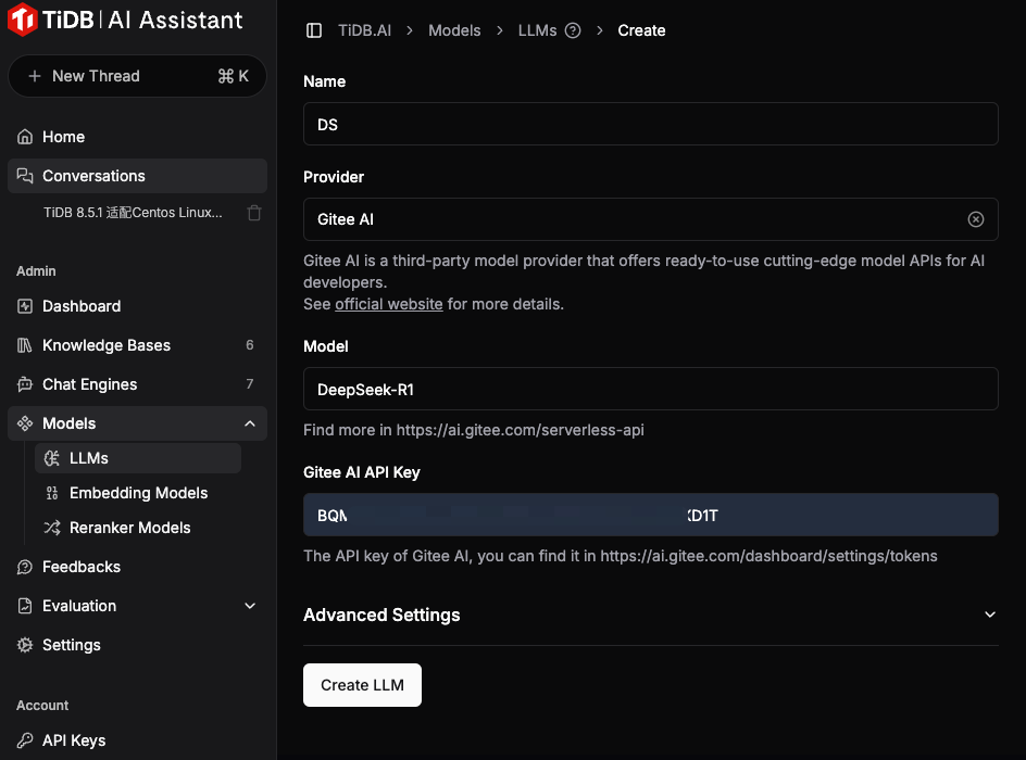 配置LLM模型。选择Gitee AI服务商,添加DeepSeek模型,例如DeepSeek-R1模型:
