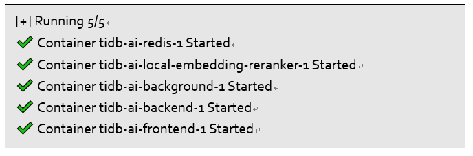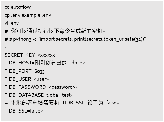 AutoFlow支持本地部署,以下是使用Docker Compose进行部署的简要步骤。具体细节可参考官方文档:https://tidb.ai/docs/deploy-with-docker
