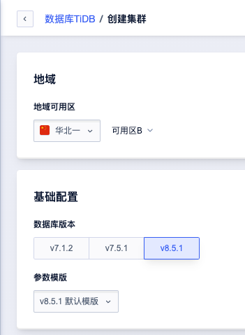 3. 在优刻得控制台新建一个8.5.1版本的TiDB,并且开启TiFlash。需要与之前的主机在同一项目,同一VPC下,确保与快杰云主机网络互通