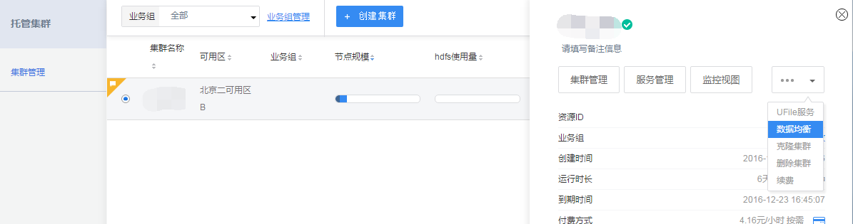 - 使用其他的压缩格式。因为gzip压缩需要保持整个文件完整才能解压,推荐使用lzo格式,即使文件部分损坏,也可以保证任务继续运行。添加节点成功后,后台会自动进行数据均衡。如果长时间之后,集群的数据量还是不均衡,可以在“集群管理”页面提交数据均衡请求,如下图: