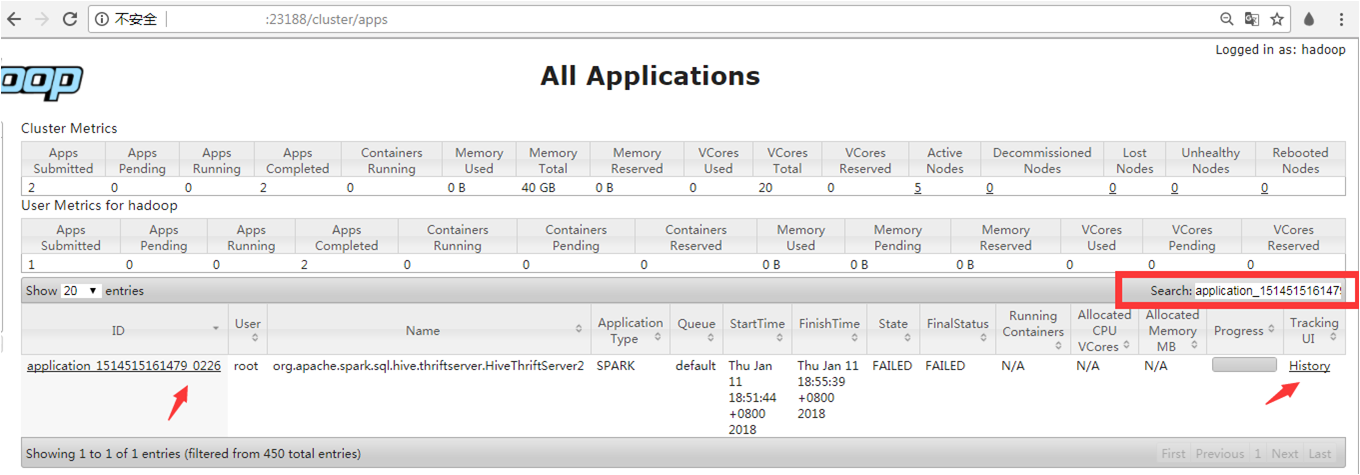 可以通过 http://外网IP:23188/cluster 查看yarn resource manager 信息。