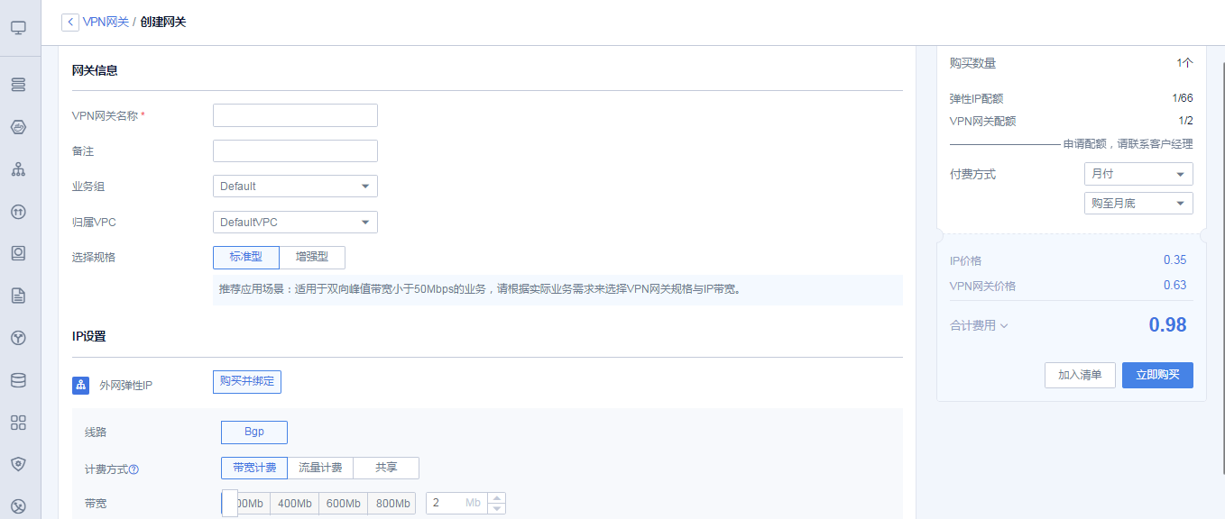 进入创建VPN网关页面后,依次填写信息,选择付费模式,可购买VPN网关。