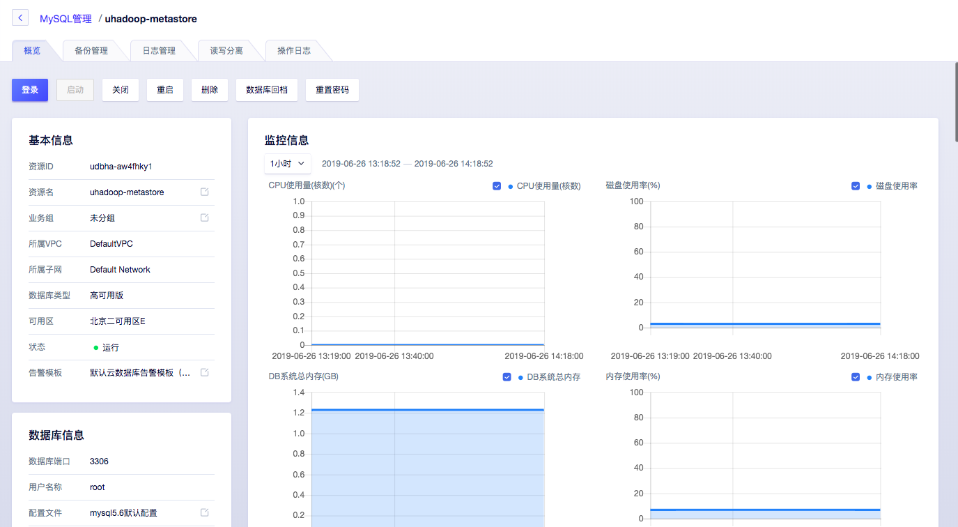 数据库的监控信息可以在 UDB 控制台查看。为了保证 UHadoop 集群中任务的正常执行,请谨慎对此 UDB 做操作。