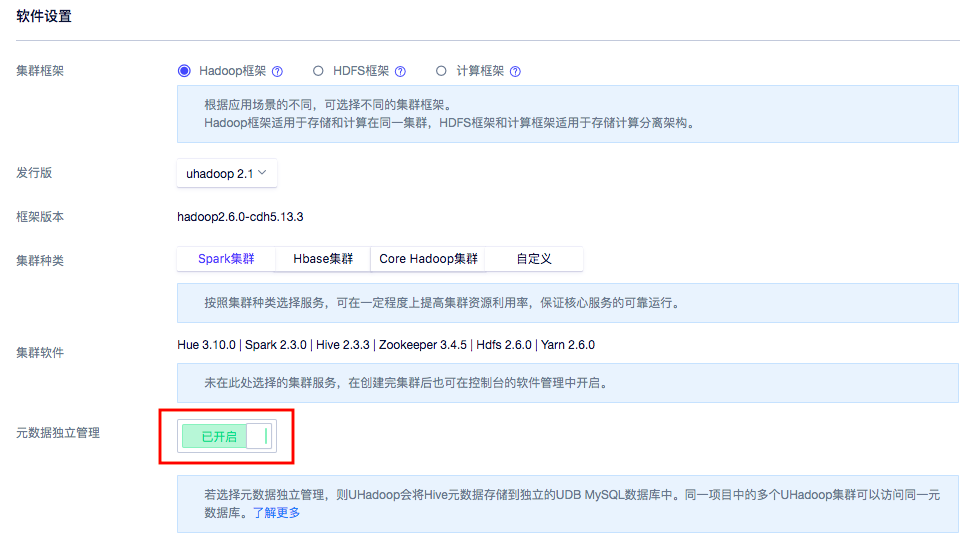 UHadoop 支持将 Hive-Metastore 的数据库独立于 Hadoop 集群部署,也支持多个集群访问同一个 Hive 元数据库,可在控制台对其做管理。